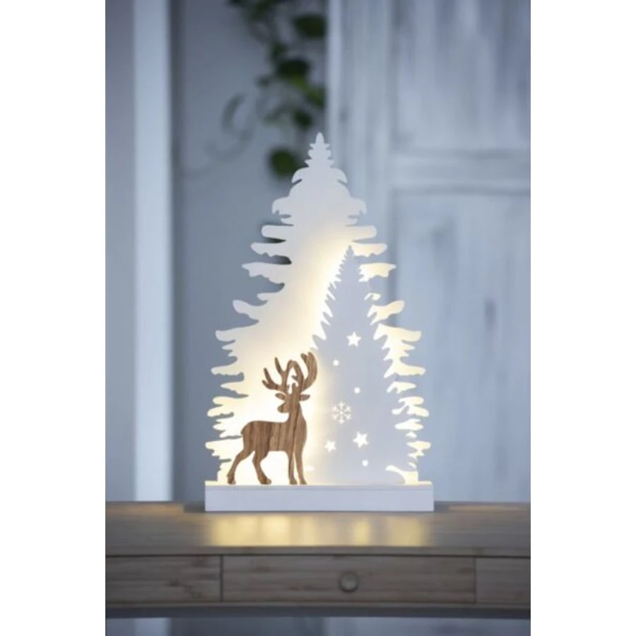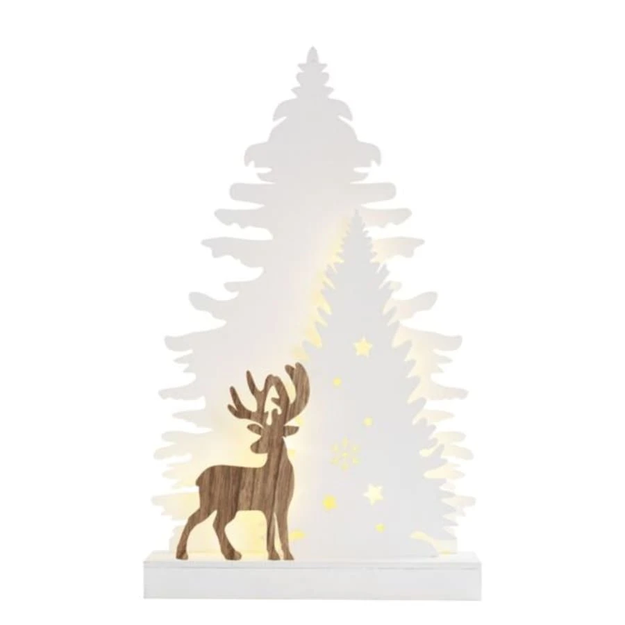 Large 44 cm x 26.4 cm x 6.3 cm wooden table fir. The shade of the trees is white, the reindeer has a wood tone.
