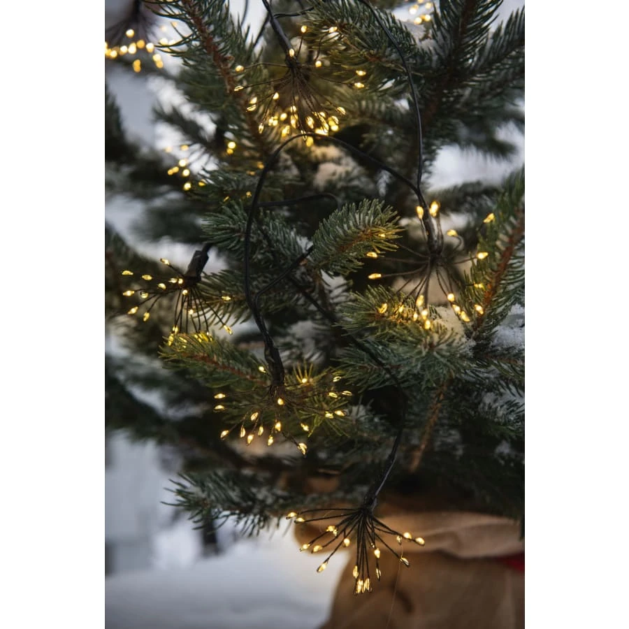 Light decorations in ”flowers” of 20 LEDs, always every 20 cm. LED bundles can be bent. A total of 200 warm white LEDs in the 2 m long light series.