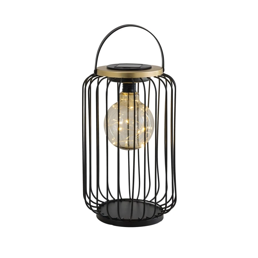 The shape of the solar lantern breathes an edgy and sleek retro style. A brilliant light string of ten LEDs inside the lampshade brings surprising lightness. Material metal, size h. 30 cm, Ø 20 cm. Replaceable battery Ni-Mh AA 300 mAh 1.2 V.