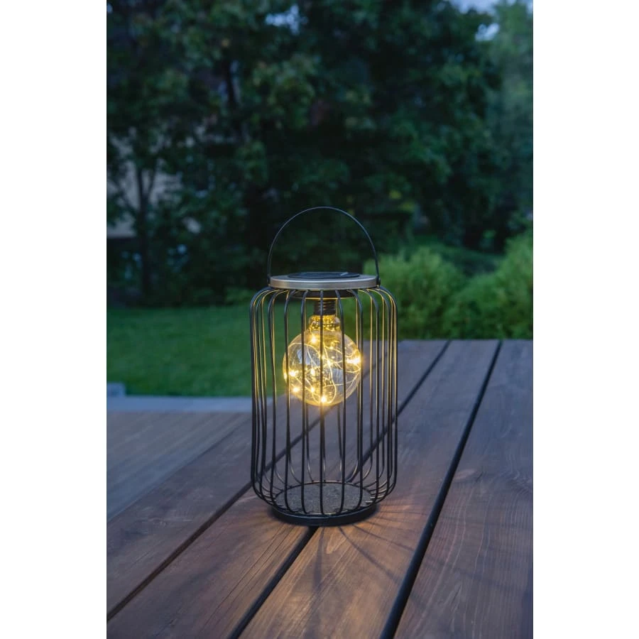 Formen på solcellslyktan andas en edgy och elegant retrostil. En lysande ljusslinga med tio lysdioder inuti lampskärmen ger överraskande lätthet. Material metall, storlek h. 30 cm, Ø 20 cm. Utbytbart batteri Ni-Mh AA 300 mAh 1,2 V.