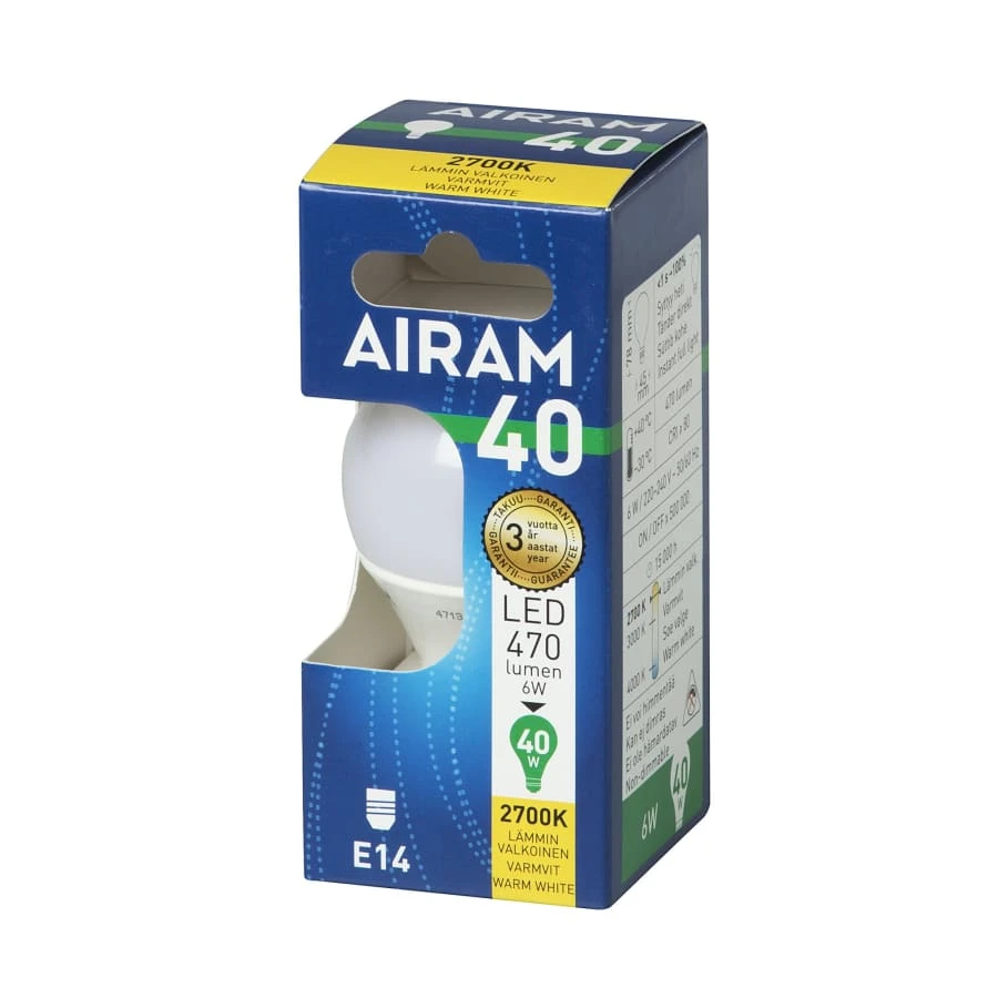 Lampans färgtemperatur är behagligt varmvit (2700 K). Den opala ljuskällan ger bländfritt ljus. Den miljövänliga kartongförpackningen är färgkodad. Färgen indikerar glödlampans motsvarighet och gör valet enklare.