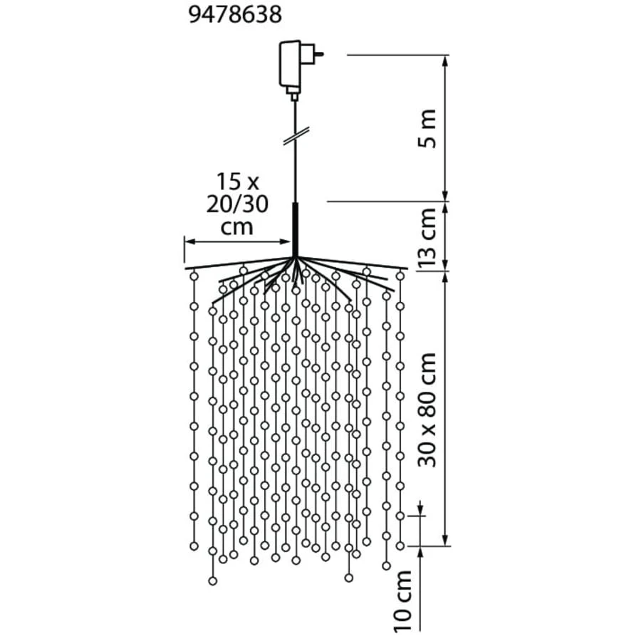 Taivuta oksat (15 kpl) auki ”sateenvarjomaisesti” ja sen jälkeen rullaa auki valolangat, joita on jokaisessa oksassa kaksi kpl. Valolangat voi jättää roikkumaan tai taivuttaa haluttuun muotoon.