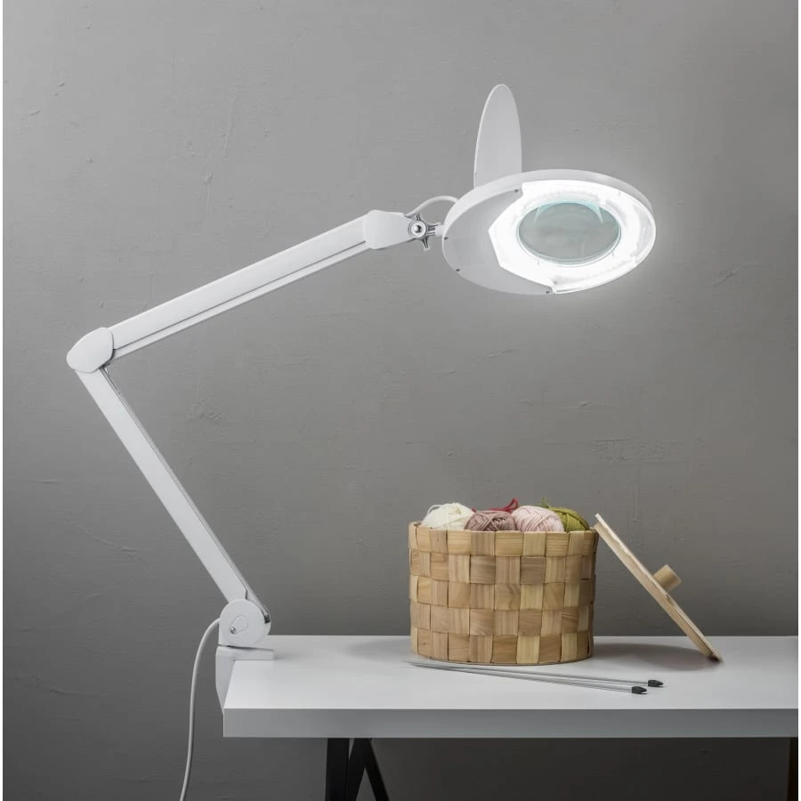 Den förstorande LED-lampan är ett utmärkt hjälpmedel för jobb och hobbyer som kräver precision. Lampans kraftfulla 5″ 3D-glaslins har en 1,75-faldig förstoringseffekt. Fäst lampan ordentligt i kanten av bordet eller bänken med det skruvbara bordsfästet. Med det stängbara locket påtryckt fungerar lampan även som en vanlig arbetsplatslampa. Strömbrytaren sitter i lampkroppen.